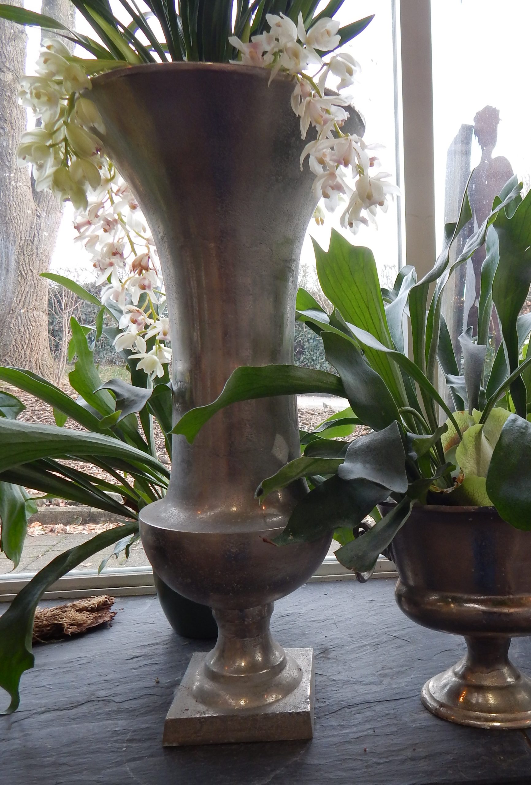 Dekorativer Pokal aus unbehandeltem Aluminium. Mit verschiedenen Blumen-Arrangements versehen kam dieser Eyecatcher sehr häufig bei Hochzeitsdekorationen zum Einsatz. Auch für Topfpflanzen im Indoor-Bereich geeignet.