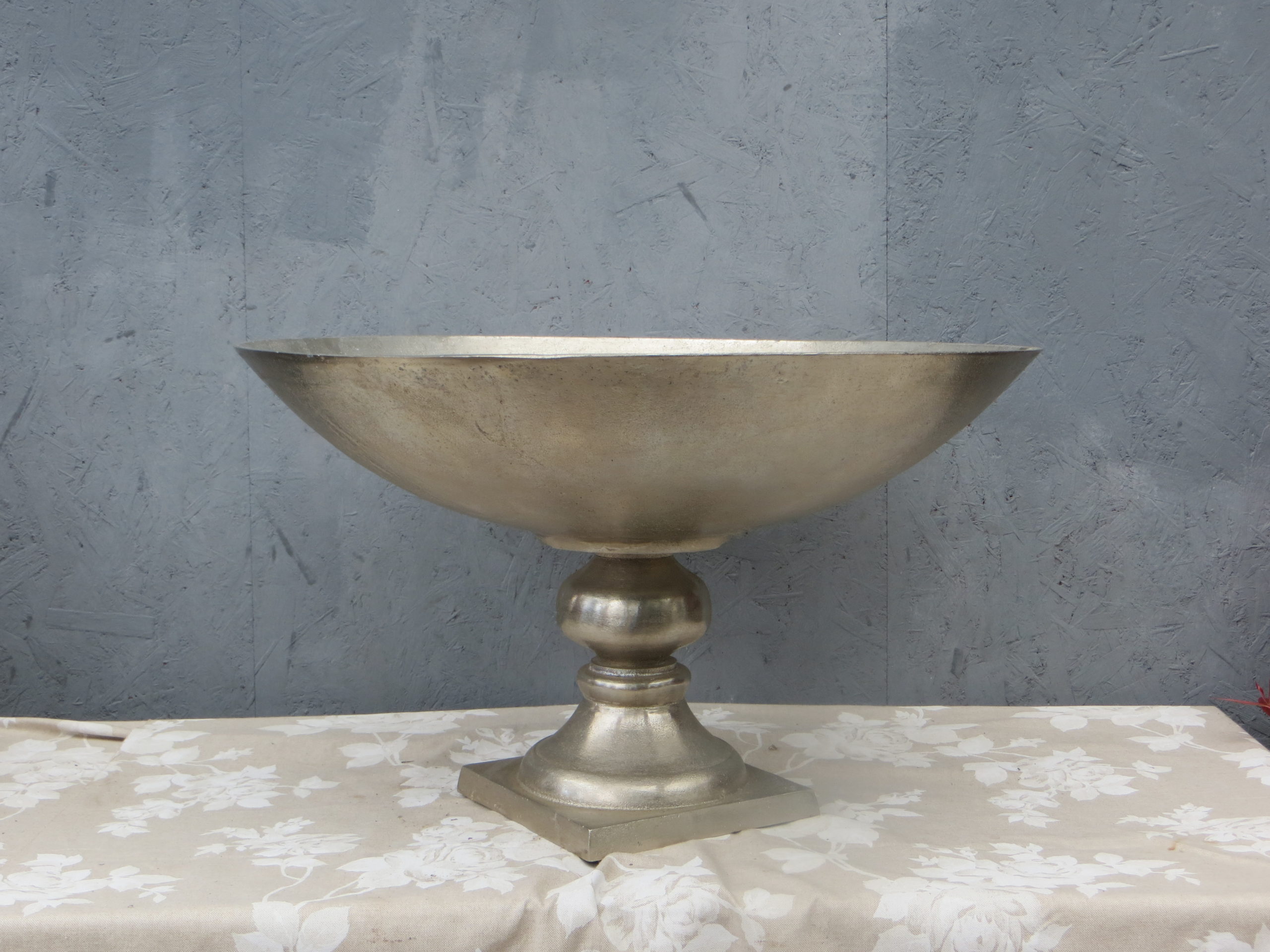 Dekorativer Schale mit Fuß aus unbehandeltem Aluminium. Mit verschiedenen Blumen-Arrangements versehen kam diese auffällige Schale sehr häufig bei Hochzeitsdekorationen zum Einsatz. Bestens geeignet zum Kühlen von Wein- und Sektflaschen – einfach mit crushed-ice oder Eiswürfeln füllen.