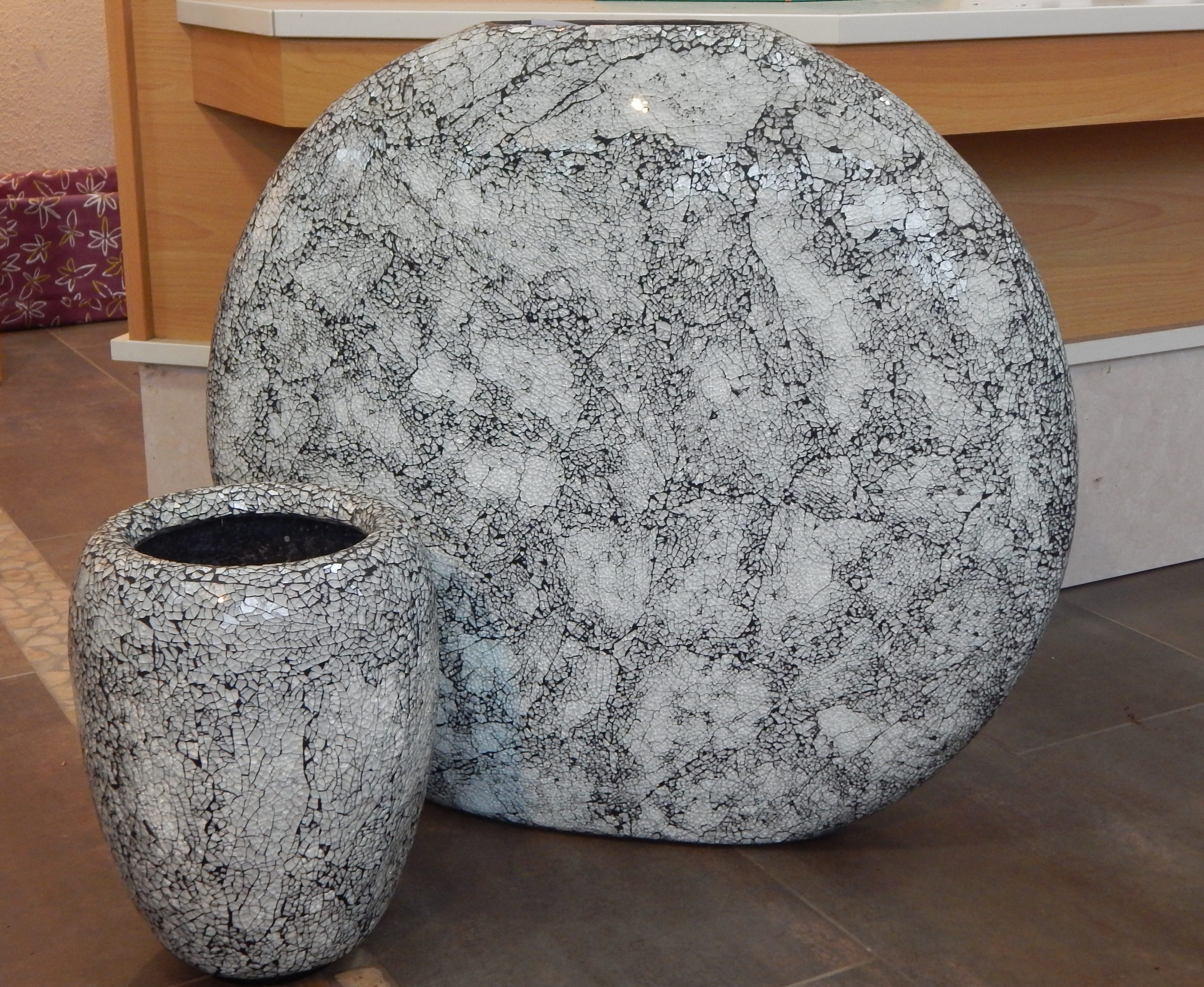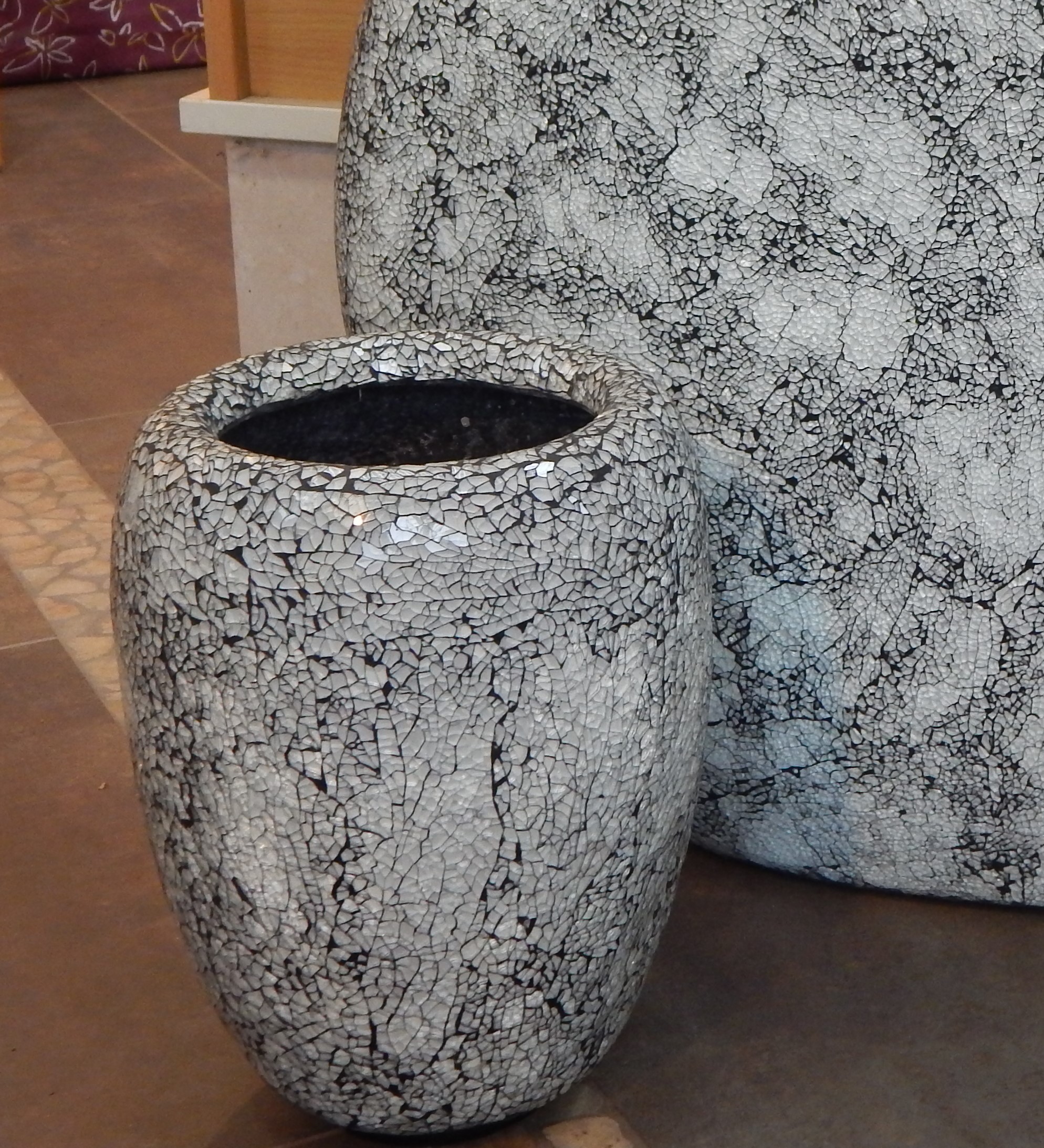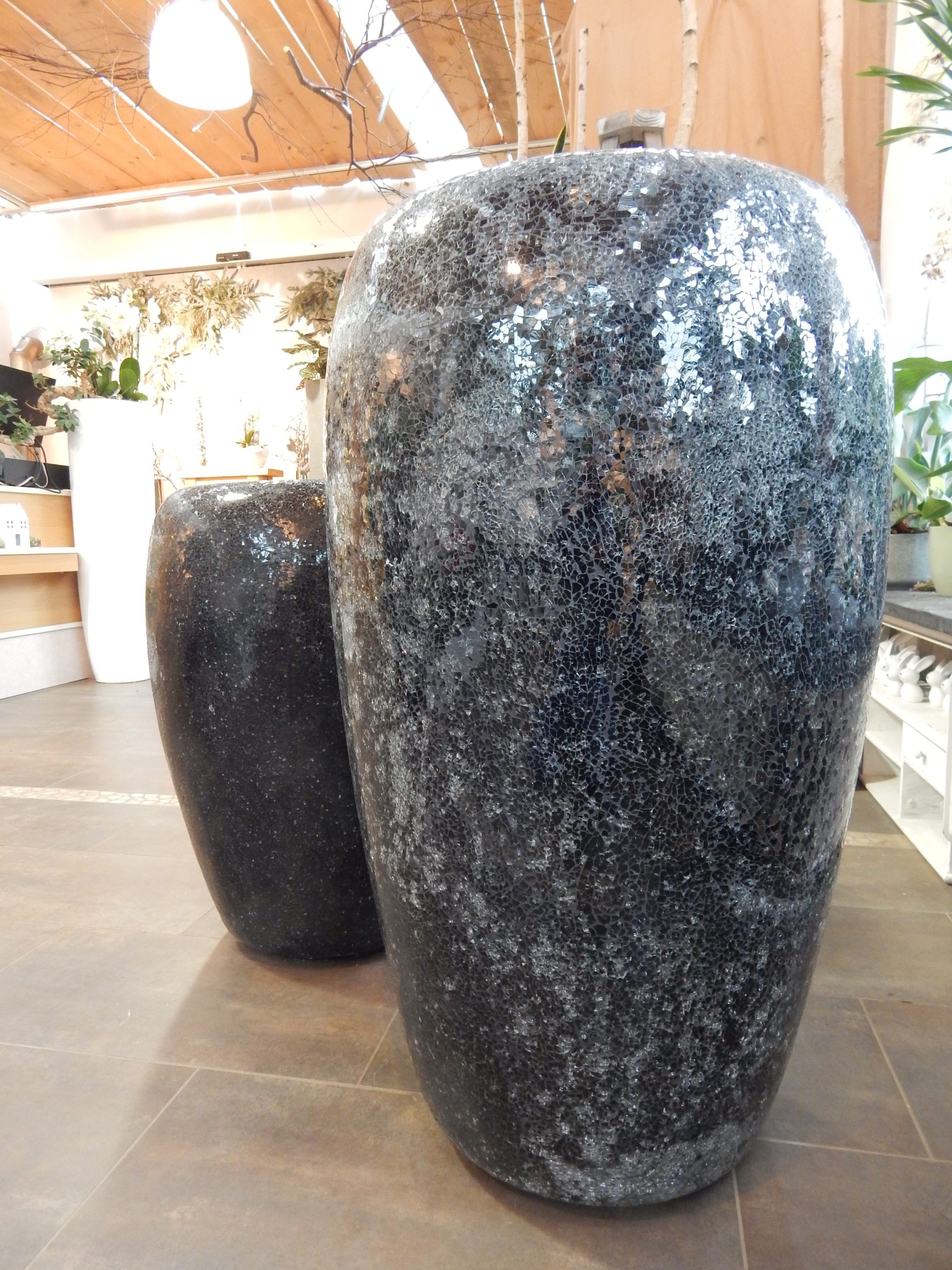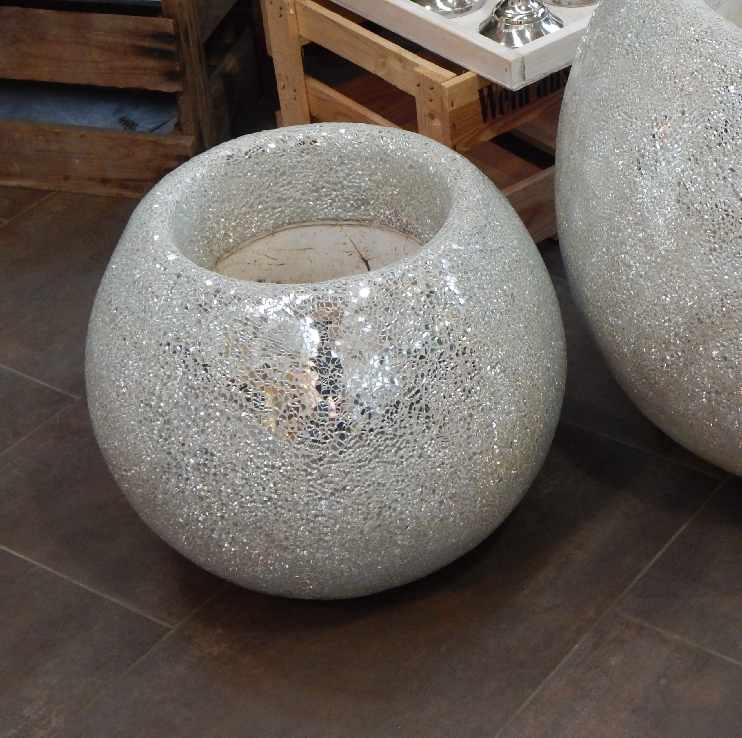 Scheinbar in tausend Stücke zerbrochene Glas- bzw. Spiegelflächen geben diesem Pflanzgefäß einen geheimnisvollen und edlen Look. Einfallendes Licht bricht sich auf den Oberflächen und macht sie so zu einem Hingucker. In Handarbeit wird auf die lackierte Oberfläche eines Fiberglas-Korpus das Mosaik aufgebracht, geschliffen und verfugt.