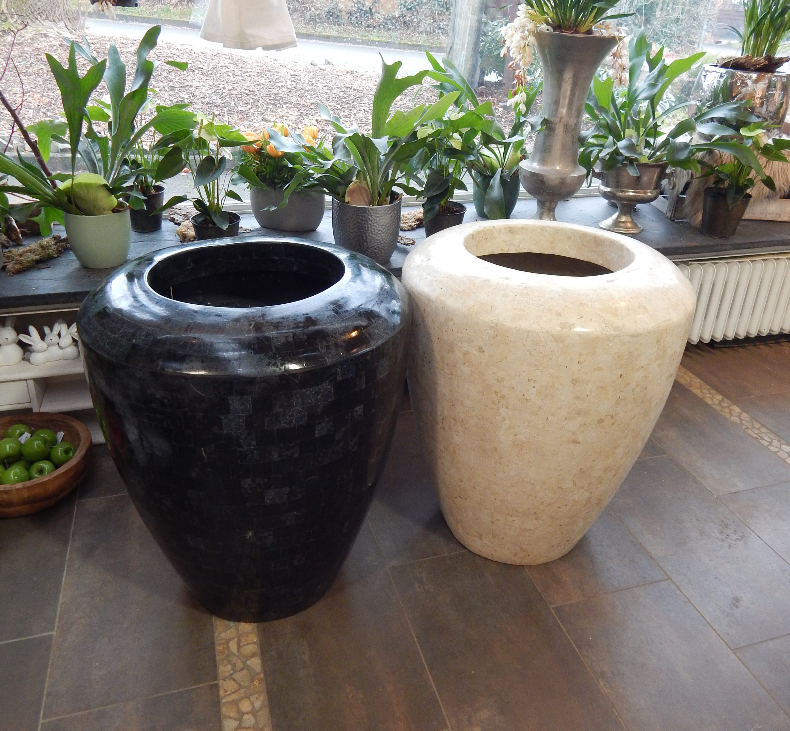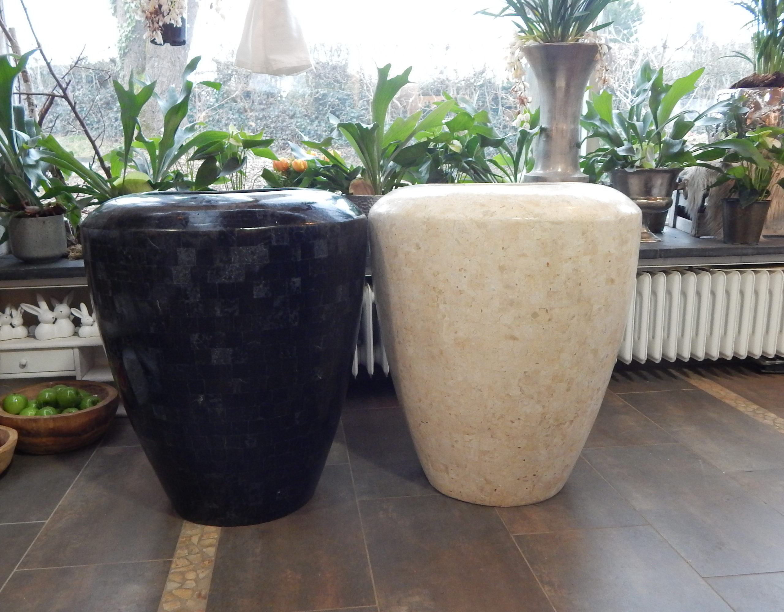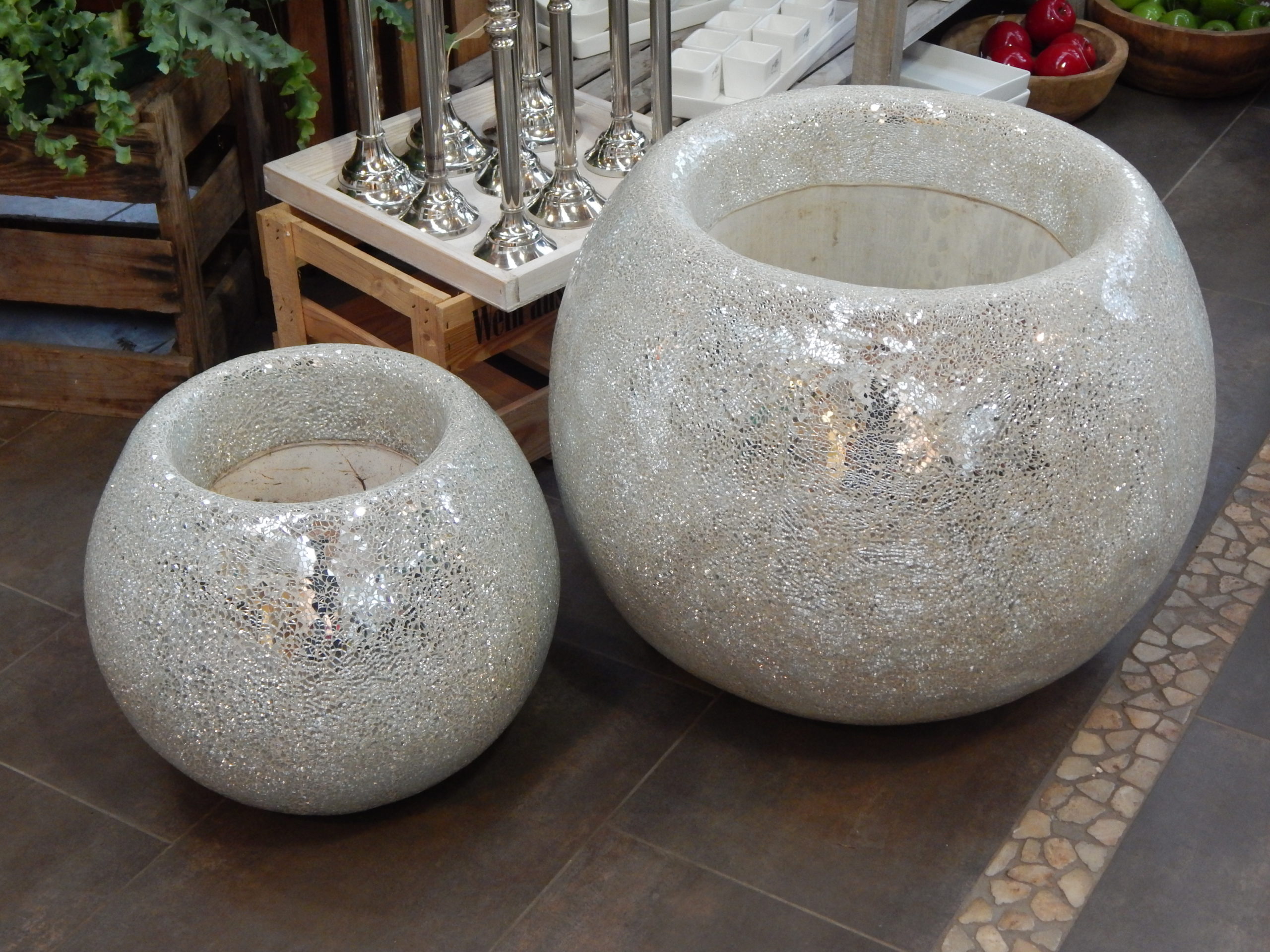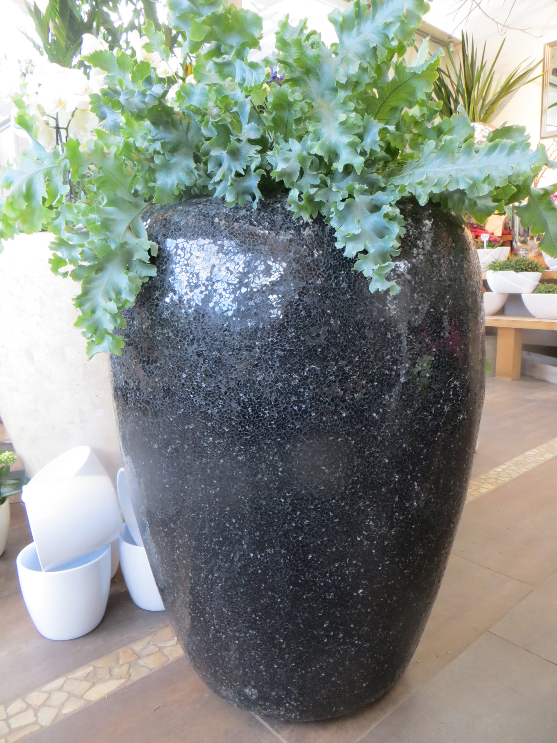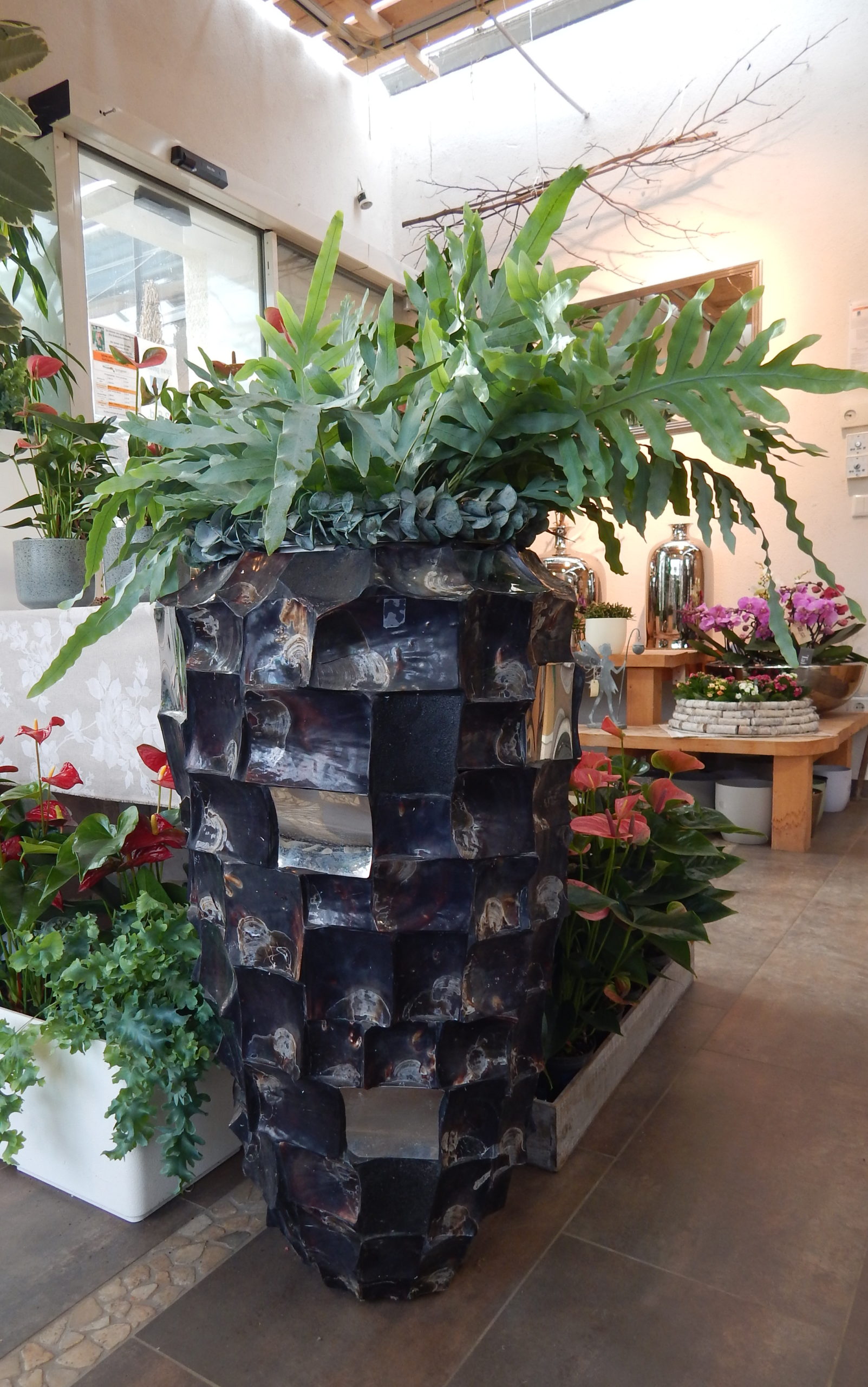 Scheinbar in tausend Stücke zerbrochene Glas- bzw. Spiegelflächen geben diesem Pflanzgefäß einen geheimnisvollen und edlen Look. Einfallendes Licht bricht sich auf den Oberflächen und macht sie so zu einem Hingucker. In Handarbeit wird auf die lackierte Oberfläche eines Fiberglas-Korpus das Mosaik aufgebracht, geschliffen und verfugt.