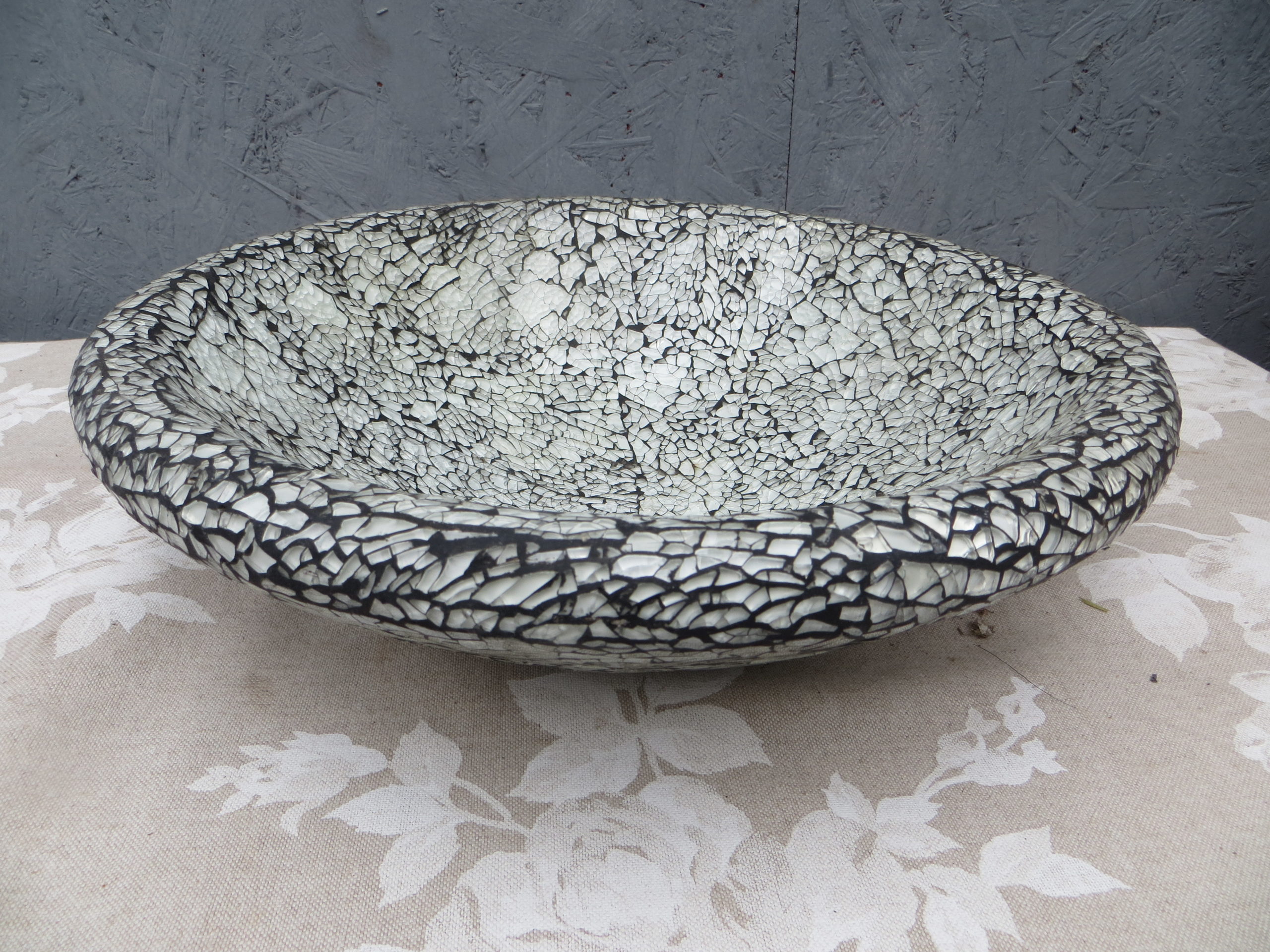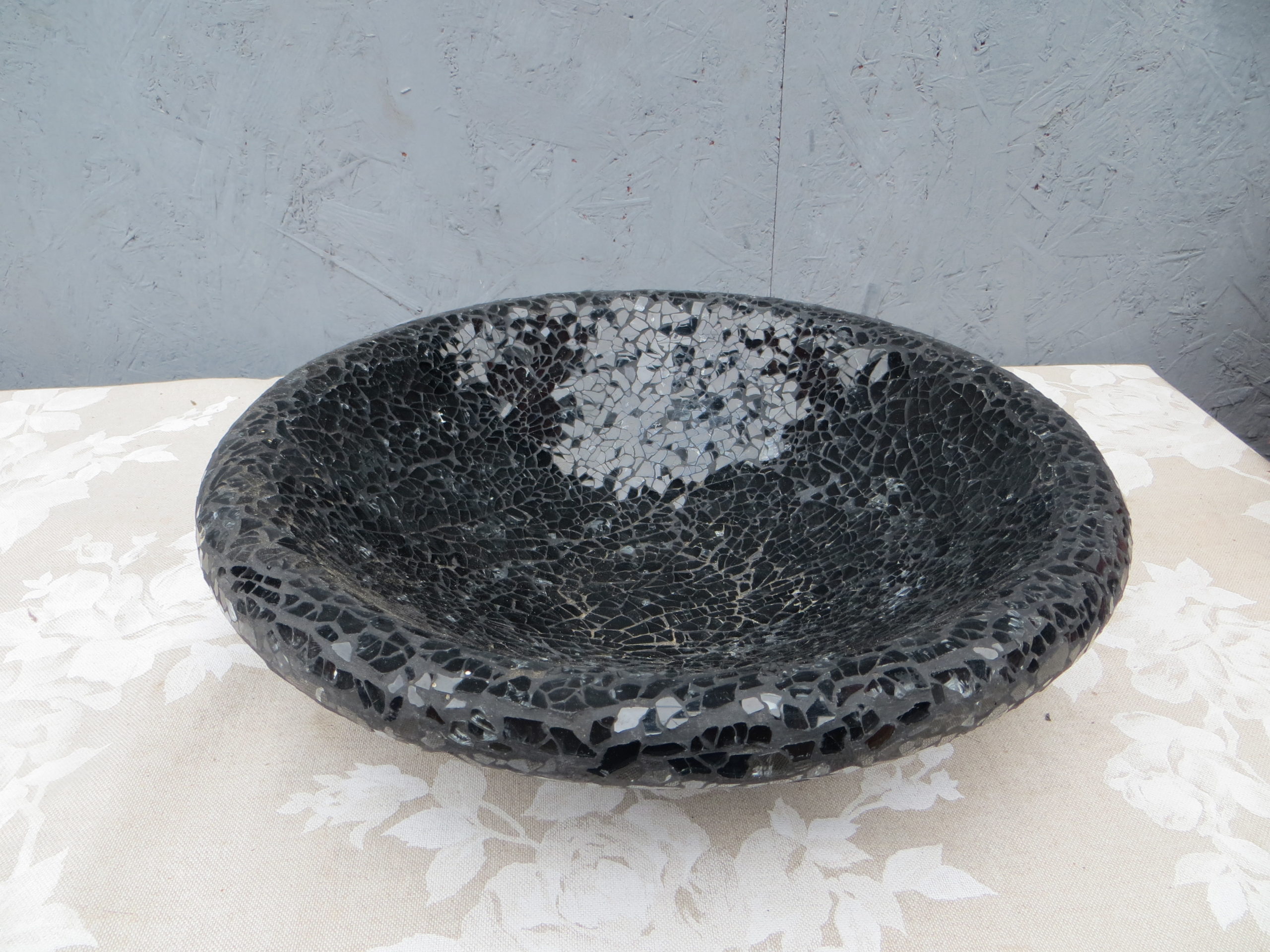 Scheinbar in tausend Stücke zerbrochene Glas- bzw. Spiegelflächen geben dieser Schale einen geheimnisvollen und edlen Look. In Handarbeit wird auf die lackierte Oberfläche eines Fiberglas-Korpus das Mosaik aufgebracht, geschliffen und verfugt.