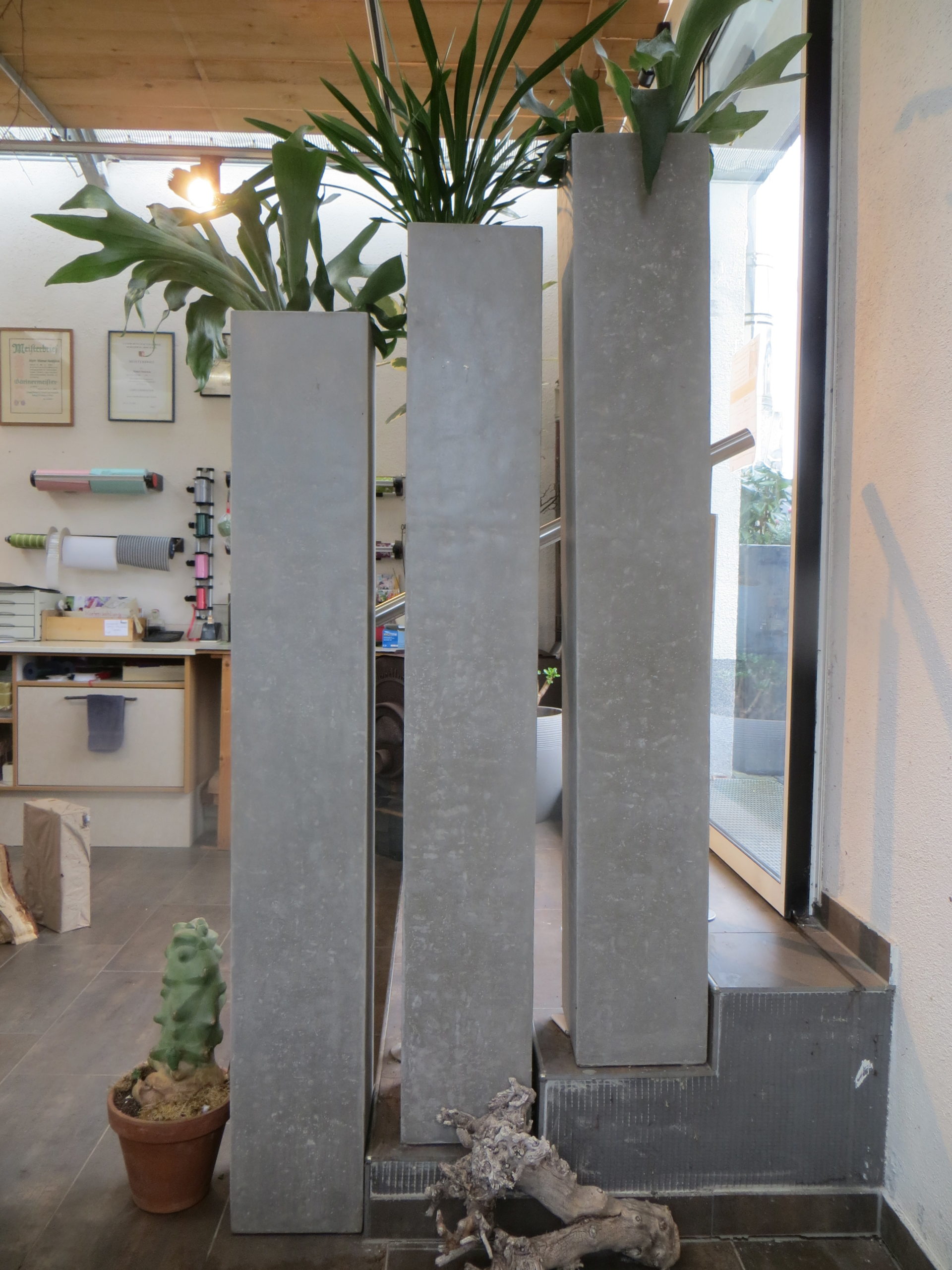 Diese in Betonoptik gestalteten Pflanzgefäße haben ein Kontergewicht im Gefäßboden, das für mehr Standfestigkeit sorgt.