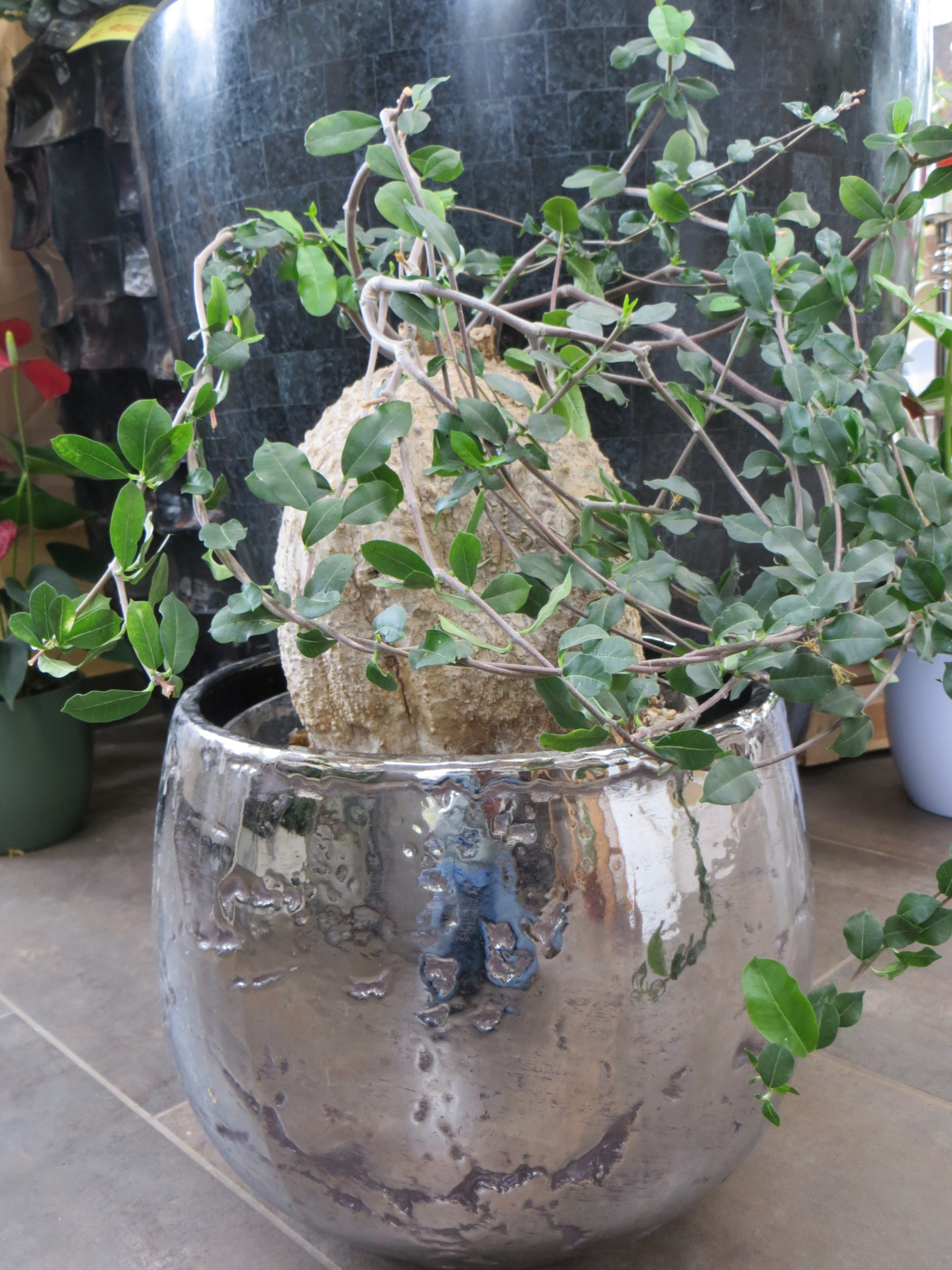 Fockea edulis ist eine außergewöhnliche Pflanze und stammt aus der trockenen sowie steinigen Savanne in Südafrika und Namibia. Die Knolle kann bis zu 60 cm Durchmesser erreichen, die Ranken werden bis zu vier Meter lang. Blütenzauber im Spätsommer mit sternenförmigen grün-gelben Blüten. Genießen Sie die Leichtigkeit der Pflege, da die Fockea edulis sich gerne an verschiedene Umgebungen anpasst und sich als robuste Zimmerpflanze erweist.